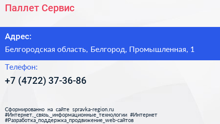 Паллет Сервис по адресу Белгородская область, Белгород, Промышленная, 1 в дальнейшем Организация, размещена в следующих категориях: