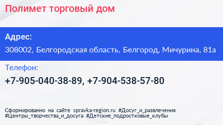 Полимет, торговый дом по адресу 308002, Белгородская область, Белгород, Мичурина, 81а в дальнейшем Организация, размещена в следующих категориях: