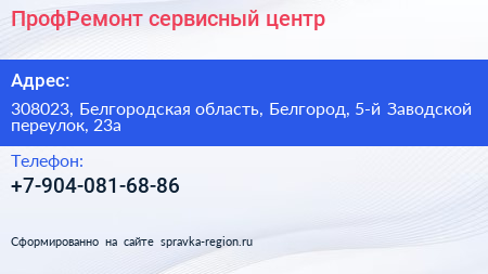 ПрофРемонт, сервисный центр по адресу 308023, Белгородская область, Белгород, 5-й Заводской переулок, 23а в дальнейшем Организация, размещена в следующих категориях:
