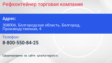 Рефконтейнер, торговая компания по адресу 308006, Белгородская область, Белгород, Производственная, 4 в дальнейшем Организация, размещена в следующих категориях: