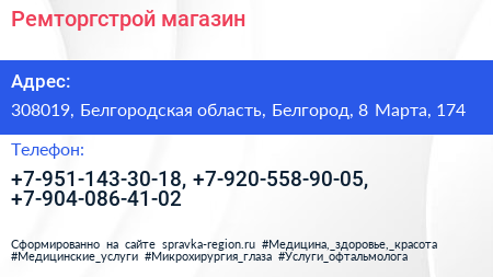 Ремторгстрой, магазин по адресу 308019, Белгородская область, Белгород, 8 Марта, 174 в дальнейшем Организация, размещена в следующих категориях: