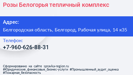 Розы Белогорья, тепличный комплекс по адресу Белгородская область, Белгород, Рабочая улица, 14 к35 в дальнейшем Организация, размещена в следующих категориях: