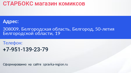СТАРБОКС, магазин комиксов по адресу 308009, Белгородская область, Белгород, 50-летия Белгородской области, 19 в дальнейшем Организация, размещена в следующих категориях: