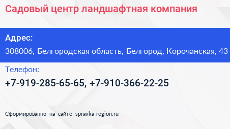 Садовый центр, ландшафтная компания по адресу 308006, Белгородская область, Белгород, Корочанская, 43 в дальнейшем Организация, размещена в следующих категориях: