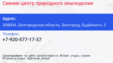 Сияние, центр природного земледелия по адресу 308004, Белгородская область, Белгород, Будённого, 3 в дальнейшем Организация, размещена в следующих категориях: