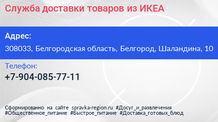 Служба доставки товаров из ИКЕА по адресу 308033, Белгородская область, Белгород, Шаландина, 10 в дальнейшем Организация, размещена в следующих категориях:
