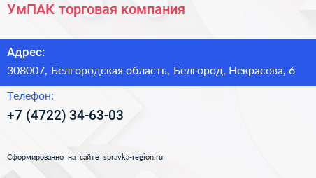 УмПАК, торговая компания по адресу 308007, Белгородская область, Белгород, Некрасова, 6 в дальнейшем Организация, размещена в следующих категориях: