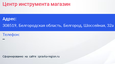 Центр инструмента, магазин по адресу 308519, Белгородская область, Белгород, Шоссейная, 32а в дальнейшем Организация, размещена в следующих категориях: