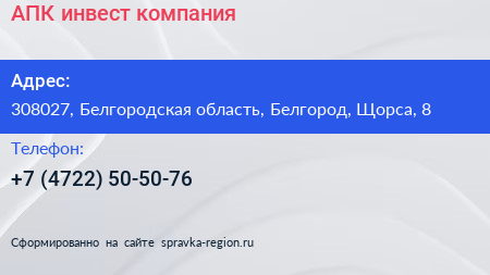 АПК-инвест, компания по адресу 308027, Белгородская область, Белгород, Щорса, 8 в дальнейшем Организация, размещена в следующих категориях: