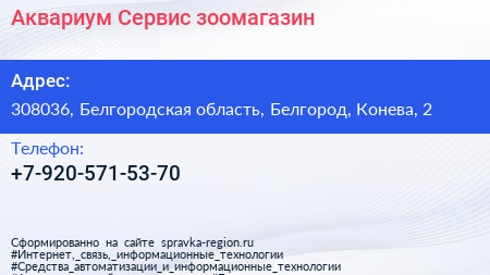 Аквариум Сервис, зоомагазин по адресу 308036, Белгородская область, Белгород, Конева, 2 в дальнейшем Организация, размещена в следующих категориях: