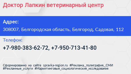 Доктор Лапкин, ветеринарный центр по адресу 308007, Белгородская область, Белгород, Садовая, 112 в дальнейшем Организация, размещена в следующих категориях: