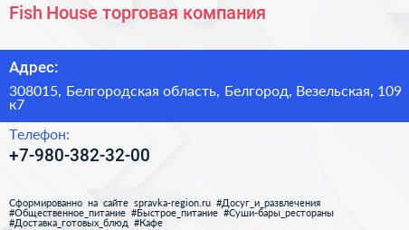 Fish House, торговая компания по адресу 308015, Белгородская область, Белгород, Везельская, 109 к7 в дальнейшем Организация, размещена в следующих категориях: