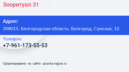 Зооритуал 31 по адресу 308015, Белгородская область, Белгород, Сумская, 12 в дальнейшем Организация, размещена в следующих категориях: