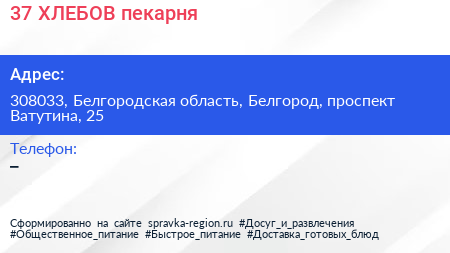 37 ХЛЕБОВ, пекарня по адресу 308033, Белгородская область, Белгород, проспект Ватутина, 25 в дальнейшем Организация, размещена в следующих категориях: