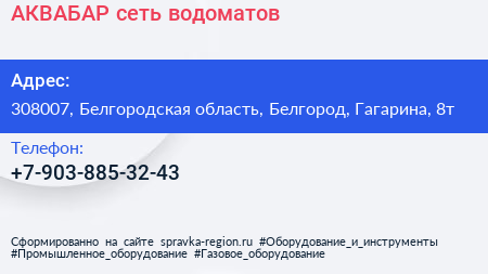 АКВАБАР, сеть водоматов по адресу 308007, Белгородская область, Белгород, Гагарина, 8т в дальнейшем Организация, размещена в следующих категориях:
