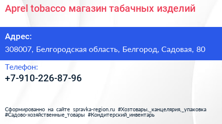 Aprel tobacco, магазин табачных изделий по адресу 308007, Белгородская область, Белгород, Садовая, 80 в дальнейшем Организация, размещена в следующих категориях: