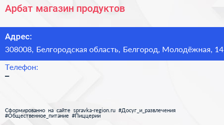 Арбат, магазин продуктов по адресу 308008, Белгородская область, Белгород, Молодёжная, 14 в дальнейшем Организация, размещена в следующих категориях: