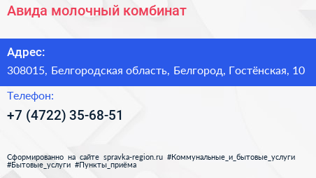 Авида, молочный комбинат по адресу 308015, Белгородская область, Белгород, Гостёнская, 10 в дальнейшем Организация, размещена в следующих категориях: