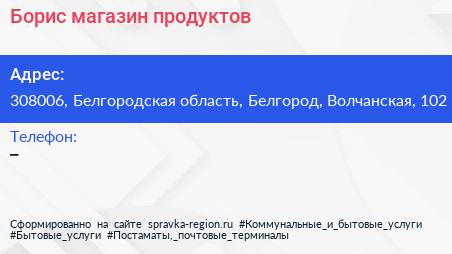 Борис, магазин продуктов по адресу 308006, Белгородская область, Белгород, Волчанская, 102 в дальнейшем Организация, размещена в следующих категориях: