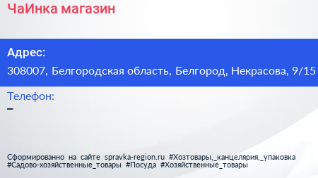 ЧаИнка, магазин по адресу 308007, Белгородская область, Белгород, Некрасова, 9/15 в дальнейшем Организация, размещена в следующих категориях: