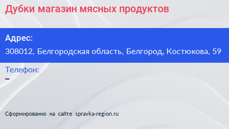 Дубки, магазин мясных продуктов по адресу 308012, Белгородская область, Белгород, Костюкова, 59 в дальнейшем Организация, размещена в следующих категориях: