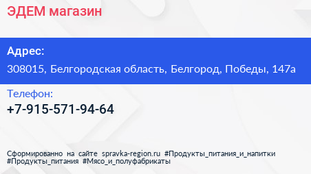 ЭДЕМ, магазин по адресу 308015, Белгородская область, Белгород, Победы, 147а в дальнейшем Организация, размещена в следующих категориях: