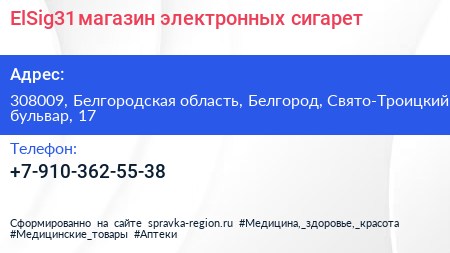 ElSig31, магазин электронных сигарет по адресу 308009, Белгородская область, Белгород, Свято-Троицкий бульвар, 17 в дальнейшем Организация, размещена в следующих категориях: