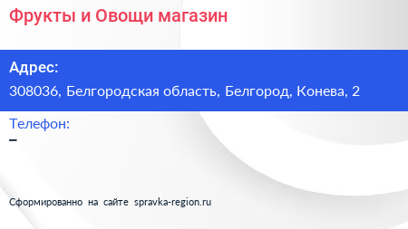 Фрукты и Овощи, магазин по адресу 308036, Белгородская область, Белгород, Конева, 2 в дальнейшем Организация, размещена в следующих категориях: