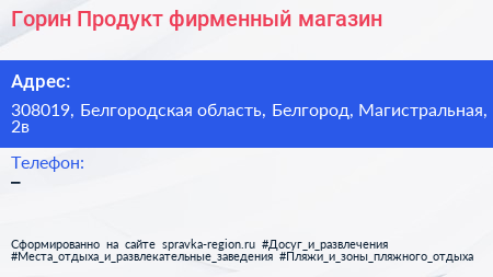 Горин Продукт, фирменный магазин по адресу 308019, Белгородская область, Белгород, Магистральная, 2в в дальнейшем Организация, размещена в следующих категориях:
