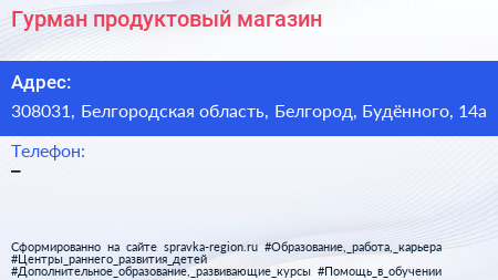 Гурман, продуктовый магазин по адресу 308031, Белгородская область, Белгород, Будённого, 14а в дальнейшем Организация, размещена в следующих категориях: