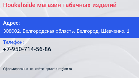 Hookahside, магазин табачных изделий по адресу 308002, Белгородская область, Белгород, Шевченко, 1 в дальнейшем Организация, размещена в следующих категориях: