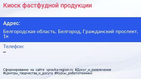 Киоск фастфудной продукции по адресу Белгородская область, Белгород, Гражданский проспект, 1к в дальнейшем Организация, размещена в следующих категориях: