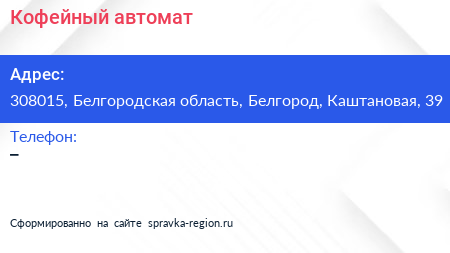 Кофейный автомат по адресу 308015, Белгородская область, Белгород, Каштановая, 39 в дальнейшем Организация, размещена в следующих категориях: