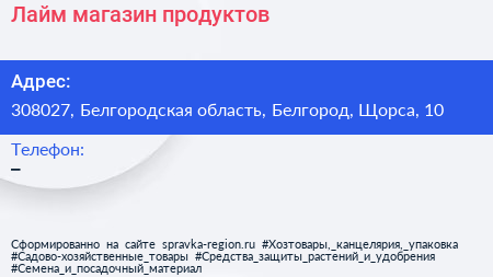 Лайм, магазин продуктов по адресу 308027, Белгородская область, Белгород, Щорса, 10 в дальнейшем Организация, размещена в следующих категориях: