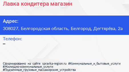 Лавка кондитера, магазин по адресу 308027, Белгородская область, Белгород, Дегтярёва, 2а в дальнейшем Организация, размещена в следующих категориях: