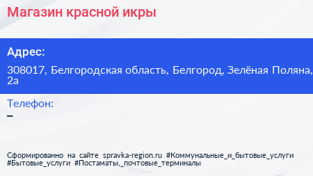 Магазин красной икры по адресу 308017, Белгородская область, Белгород, Зелёная Поляна, 2а в дальнейшем Организация, размещена в следующих категориях: