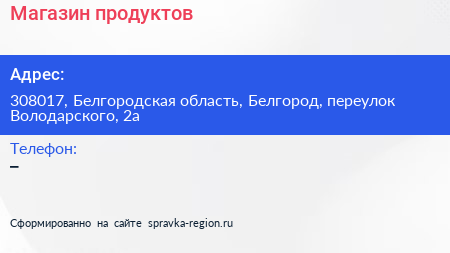 Магазин продуктов по адресу 308017, Белгородская область, Белгород, переулок Володарского, 2а в дальнейшем Организация, размещена в следующих категориях: