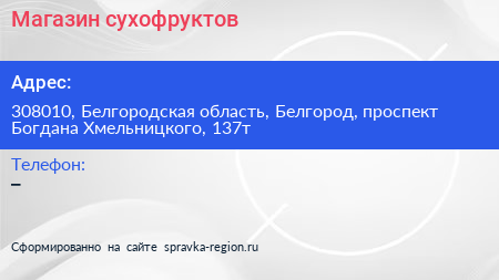 Магазин сухофруктов по адресу 308010, Белгородская область, Белгород, проспект Богдана Хмельницкого, 137т в дальнейшем Организация, размещена в следующих категориях:
