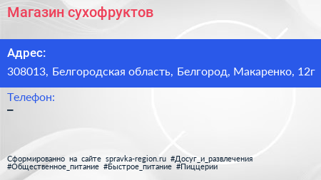 Магазин сухофруктов по адресу 308013, Белгородская область, Белгород, Макаренко, 12г в дальнейшем Организация, размещена в следующих категориях: