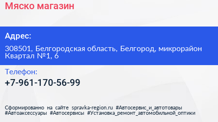 Мяско, магазин по адресу 308501, Белгородская область, Белгород, микрорайон Квартал №1, 6 в дальнейшем Организация, размещена в следующих категориях: