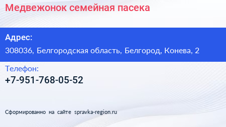 Медвежонок, семейная пасека по адресу 308036, Белгородская область, Белгород, Конева, 2 в дальнейшем Организация, размещена в следующих категориях: