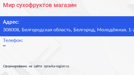 Мир сухофруктов, магазин по адресу 308008, Белгородская область, Белгород, Молодёжная, 1-а в дальнейшем Организация, размещена в следующих категориях: