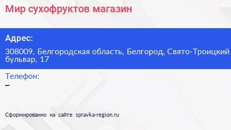Мир сухофруктов, магазин по адресу 308009, Белгородская область, Белгород, Свято-Троицкий бульвар, 17 в дальнейшем Организация, размещена в следующих категориях: