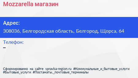 Mozzarella, магазин по адресу 308036, Белгородская область, Белгород, Щорса, 64 в дальнейшем Организация, размещена в следующих категориях: