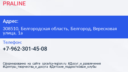 PRALINE по адресу 308510, Белгородская область, Белгород, Вересковая улица, 1а в дальнейшем Организация, размещена в следующих категориях: