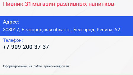 Пивник.31, магазин разливных напитков по адресу 308017, Белгородская область, Белгород, Репина, 52 в дальнейшем Организация, размещена в следующих категориях: