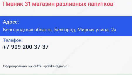 Пивник.31, магазин разливных напитков по адресу Белгородская область, Белгород, Мирная улица, 2а в дальнейшем Организация, размещена в следующих категориях: