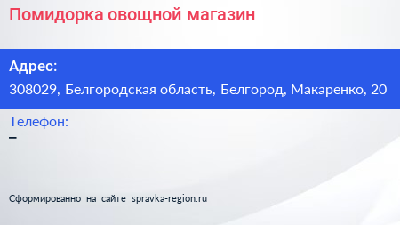 Помидорка, овощной магазин по адресу 308029, Белгородская область, Белгород, Макаренко, 20 в дальнейшем Организация, размещена в следующих категориях: