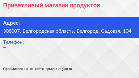 Приветливый, магазин продуктов по адресу 308007, Белгородская область, Белгород, Садовая, 104 в дальнейшем Организация, размещена в следующих категориях: