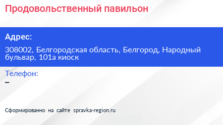 Продовольственный павильон по адресу 308002, Белгородская область, Белгород, Народный бульвар, 101а киоск в дальнейшем Организация, размещена в следующих категориях: